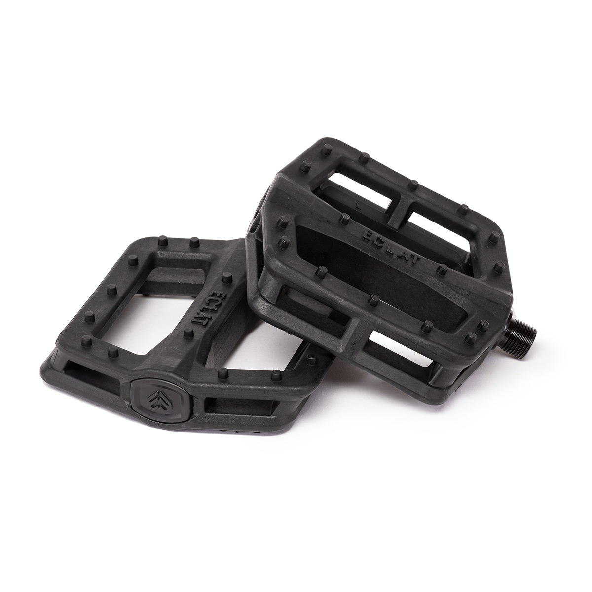 Features Large platform pedal designed together with input from Eclat PRO team riders Felix Prangenberg and Jordan Godwin Eclat exclusive oversize spindle design and unique crankarm interface with 6mm hex and without wrench flat Overall wider pedal body and more inward foot position to aid with crankarm grinds and aerial tricks Reinforced pins for improved traction and durability Low profile design with thicker ribs for added support